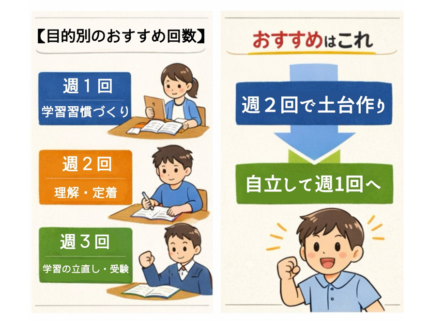 学習習慣がまだ身についていない場合は、いきなり回数を増やすよりも、まずは週1回からスタートし、継続できる状態を作ることが重要です。
