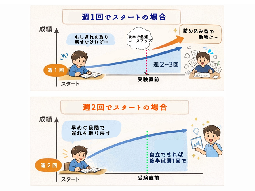 といった状態が続いてしまうと、気づいた時には、すでに取り戻すのが難しい状態になっていることが少なくありません。そして、受験が近づいた段階で「このままではまずい」となり、週2回、週3回と回数を増やしていくことになります。しかしこの時点では、“基礎が固まっていない状態で、量だけを増やす”という状況になってしまい、